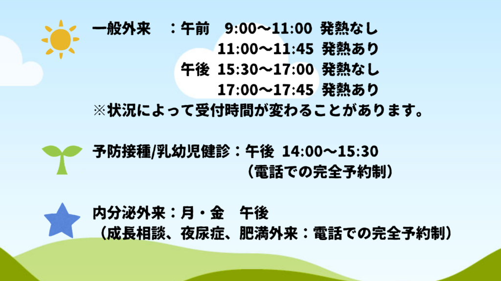 なお、感染症の流行期においては、10:30、16:30 の予約枠をお熱のある方の予約枠に変更する場合がございますのでご了承ください。